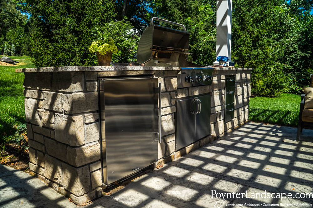 We are well-equipped to design and install the outdoor kitchen of your dreams. Functional use of outdoor space is our specialty and no other outdoor space requires more attention to detail than the outdoor kitchen, from a simple bar top surrounding your grill to a space with all the appliances you would find in any modern indoor kitchen. We can install most brands of appliances and grills and would be happy to work with the vendor of your choice or handle all the details for you. Materials to finish outdoor kitchens come in a wide variety of textures and colors, including the popular stone cladding with granite counter tops.