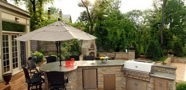 The outdoor living area consists of pool, hot tub, fireplace, outdoor kitchen, deck and pool house. We arranged these elements of the outdoor living area so areas used year round would be closest to the main house and seasonal elements such as the pool and pool house were the furthest away.
